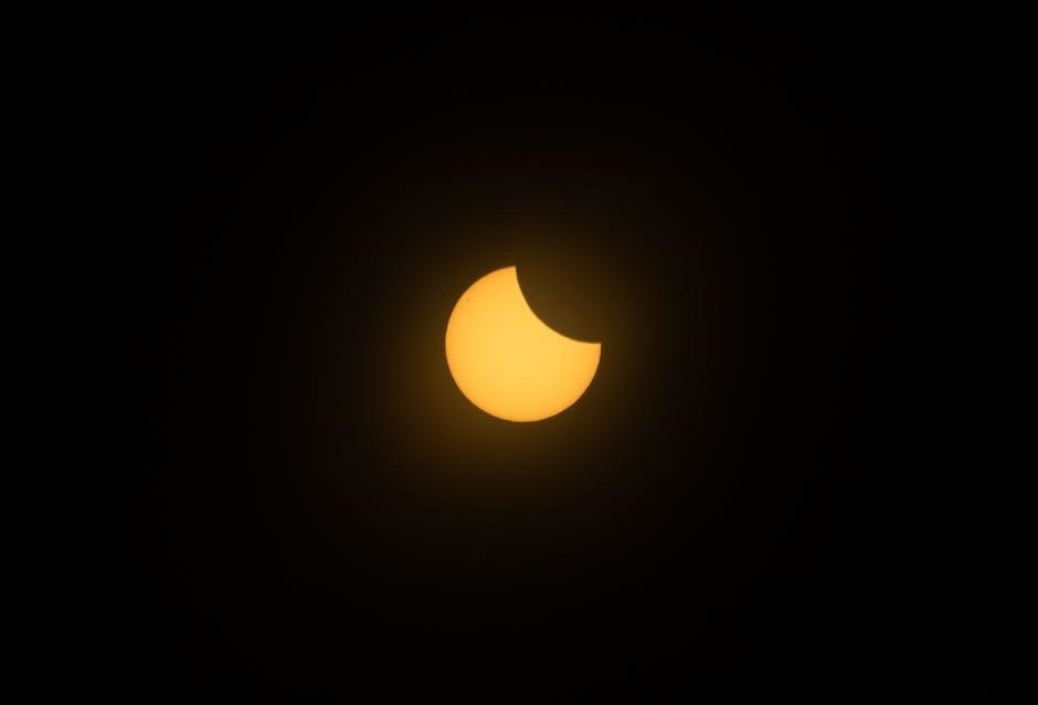Hold the moon plate in front of the sun plate, gradually covering the yellow surface to simulate the eclipse’s progression. Explain how the moon passes between the sun and Earth, casting a shadow and blocking the sun’s light. This printable PDF guide offers step-by-step instructions and diagrams for clarity.